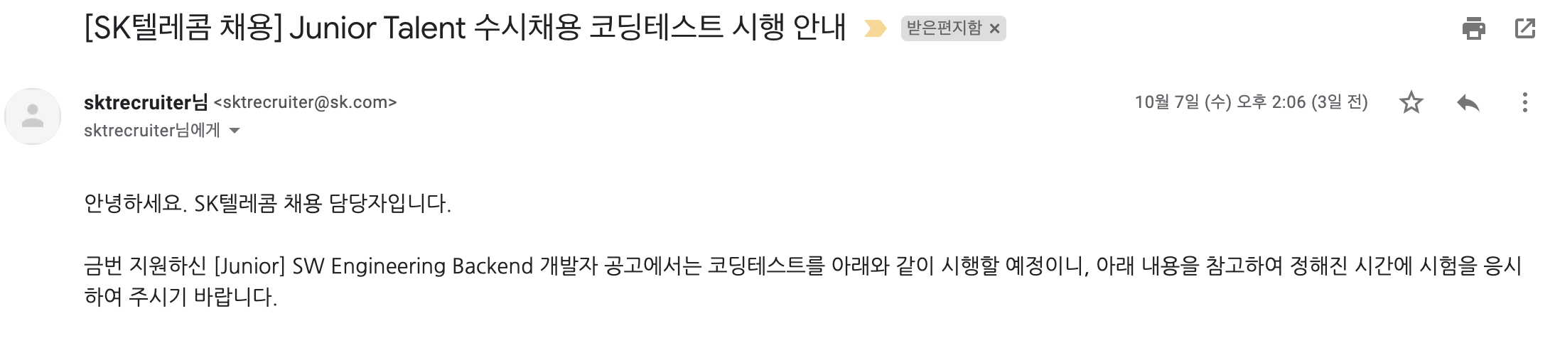 2020 하반기 SKTelecom 수시채용에 지원하여
