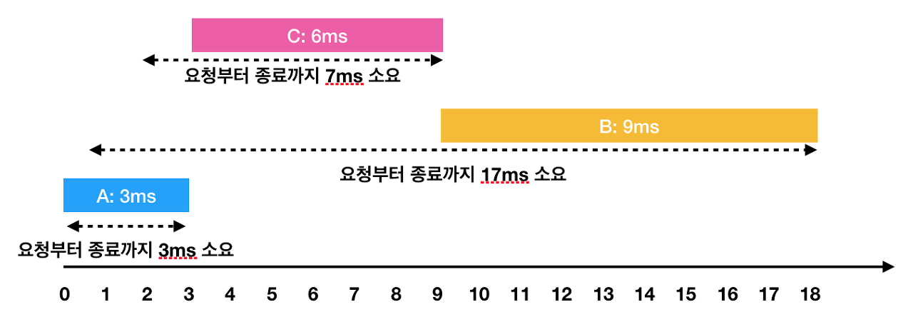 - A: 3ms 시점에 작업 완료(요청에서 종료까지 : 3ms) - C: 2ms부터 대기하다가, 3ms 시점에 작업을 시작해서 9ms 시점에 작업 완료(요청에서 종료까지 : 7ms) - B: 1ms부터 대기하다가, 9ms 시점에 작업을 시작해서 18ms 시점에 작업 완료(요청에서 종료까지 : 17ms)