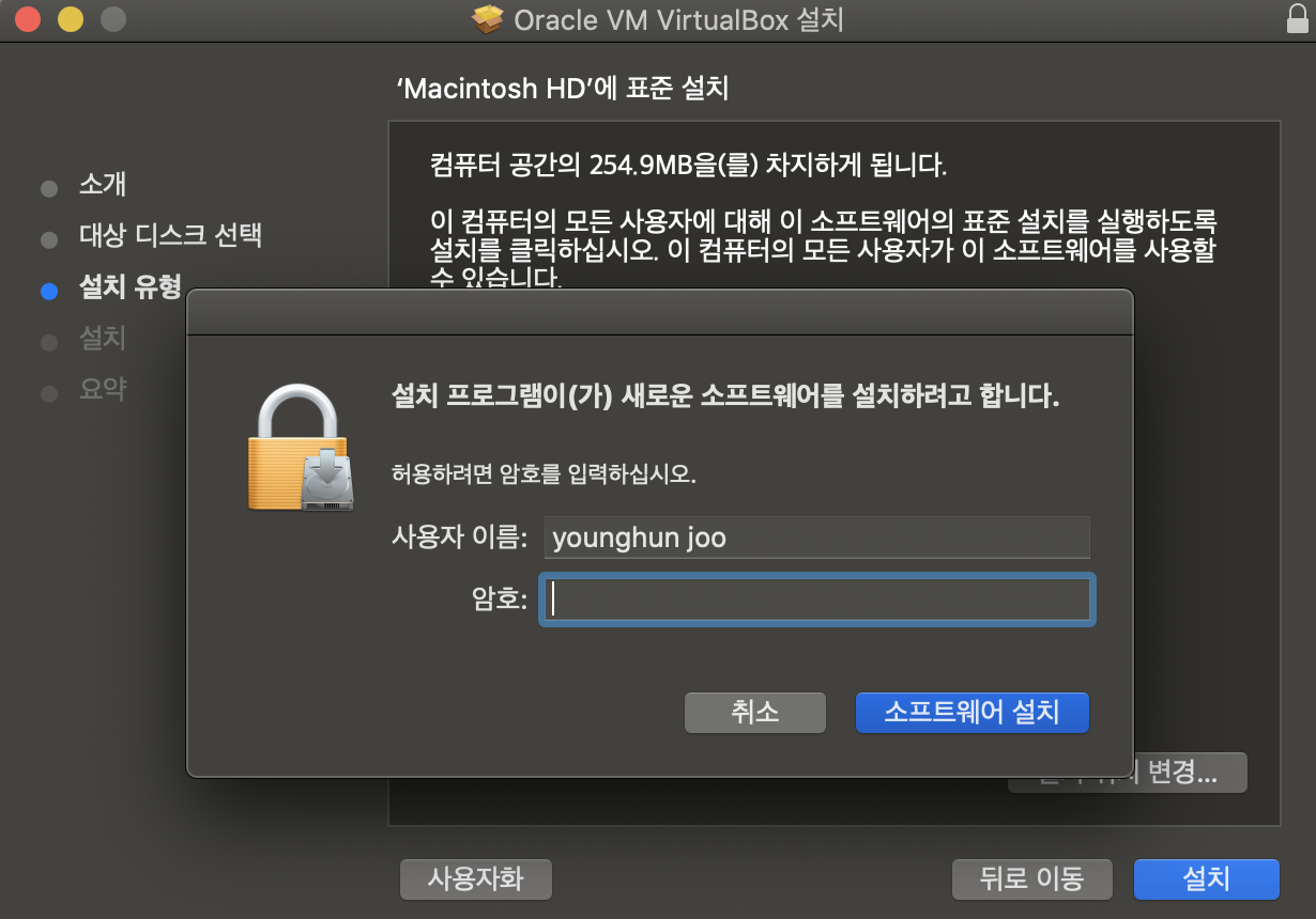 10. 자신의 mac 계정 비밀번호 입력하여 설치 진행