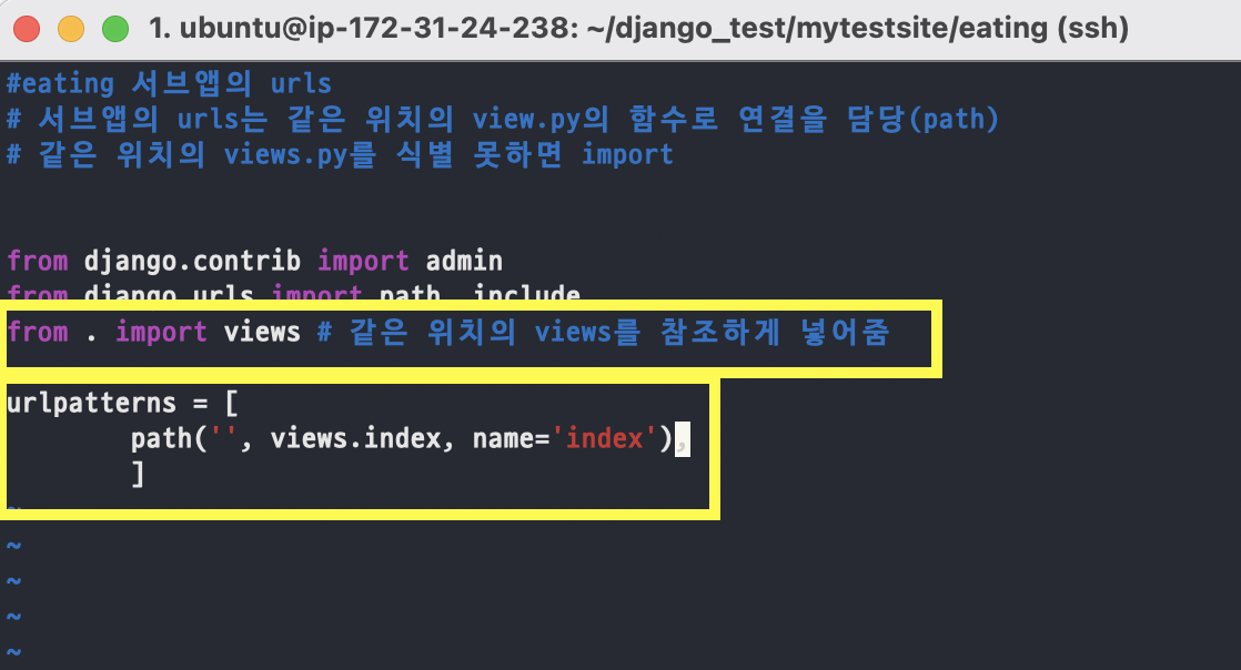 url을 분리해준다고 생각하면 된다. 하지만 서브앱 폴더에는 urls라는 파일이 없기 때문에 만들어줘야 한다.