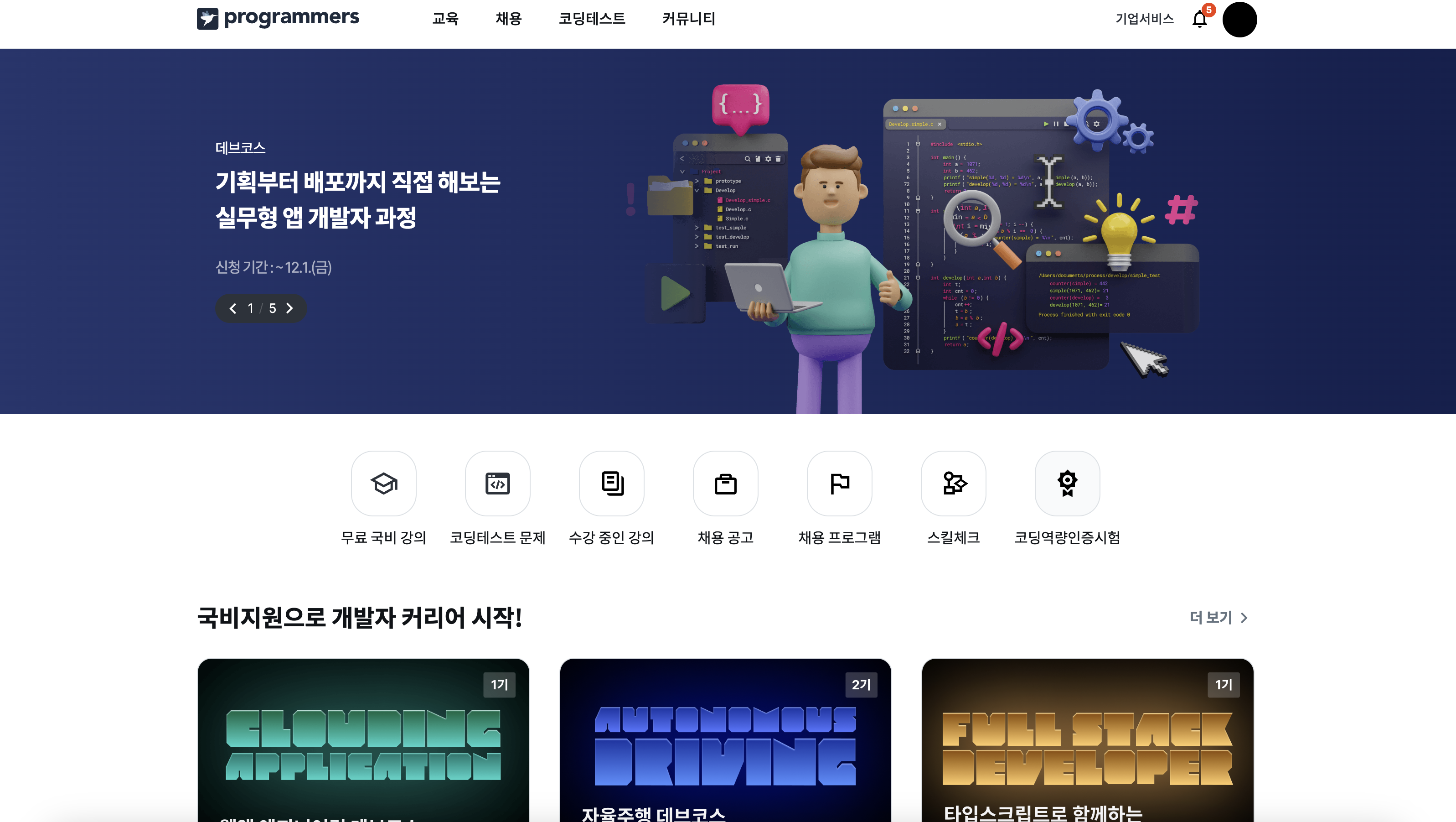 경험해보니 매우 높은 품질의 강의를 엄선하여 제공하고 있고, 국비교육 사업도 함께 진행중이므로 국비교육에 관심이 있다면 프로그래머스를 통하여 IT에 입문하며 기본개념을 경험하는 것도 추천한다.
