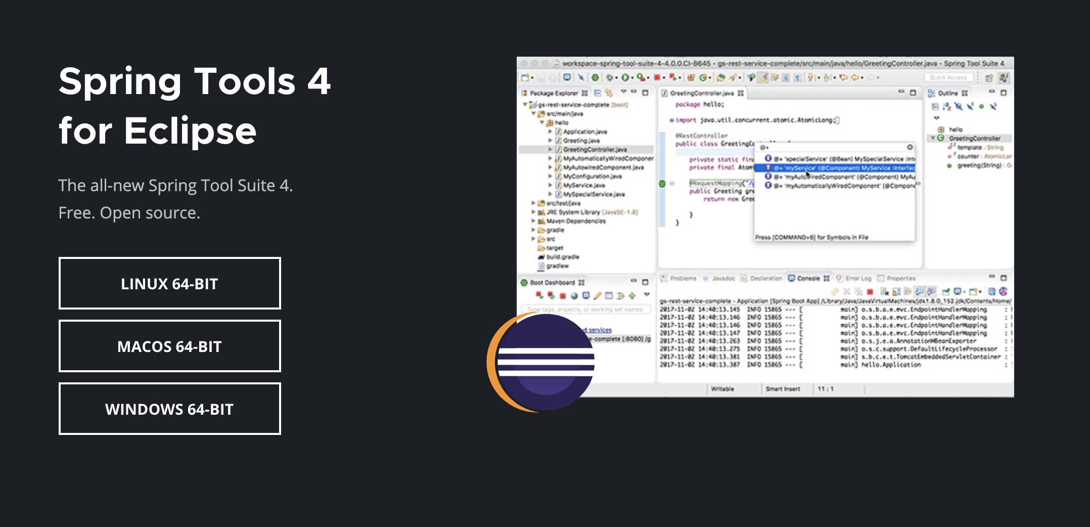 Largely rebuilt from scratch, Spring Tools 4 provides world-class support for developing Spring-based enterprise applications, whether you prefer Eclipse, Visual Studio Code, or Theia IDE.