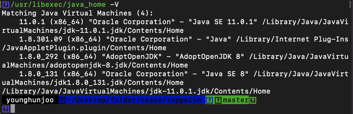 아래 명령어로 현재 정의되어 있는 java_home 의 각 java 버전을 확인하였습니다.