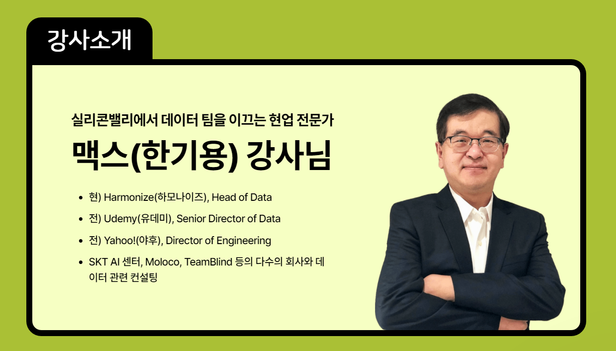 이 강의를 들으면서 나도 나중에는 데이터 팀을 이끄는 리더가 되고 싶다는 생각을 하였다. 기술을 잘하는 사람을 넘어, 회사에 정말 핵심적으로 도움을 줄 수 있는 데이터 팀을 이끌고 싶다는 꿈을 꾸게 되었다.