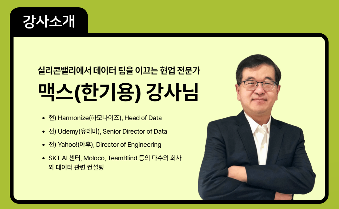 이 강의를 들으면서 나도 나중에는 데이터 팀을 이끄는 리더가 되고 싶다는 생각을 하였다. 기술을 잘하는 사람을 넘어, 회사에 정말 핵심적으로 도움을 줄 수 있는 데이터 팀을 이끌고 싶다는 꿈을 꾸게 되었다.