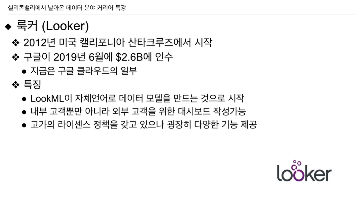 -> 룩커(Looker) 라는 솔루션을 사용했고, 내/외부 직원 및 고객들을 위한 대시보드를 만들어 서비스로 제공하였다.